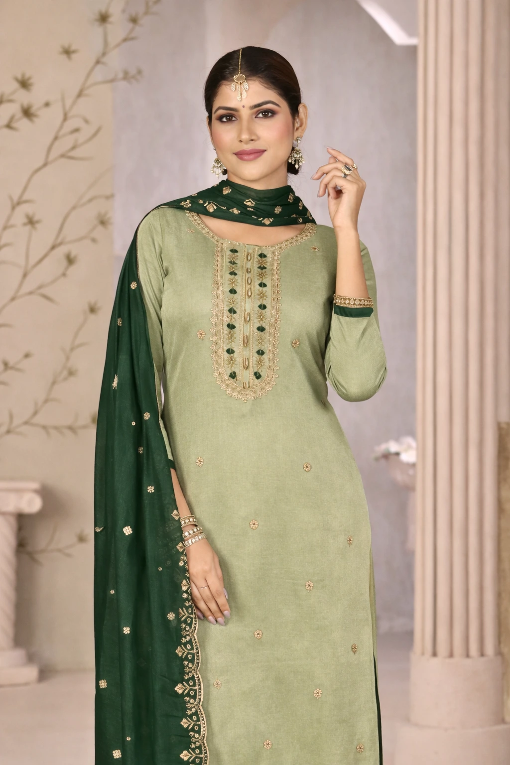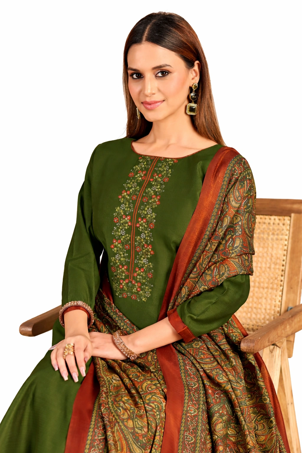 Roman Silk Salwar Suit with Bhagalpuri Dupatta – Olive Green and Rust
