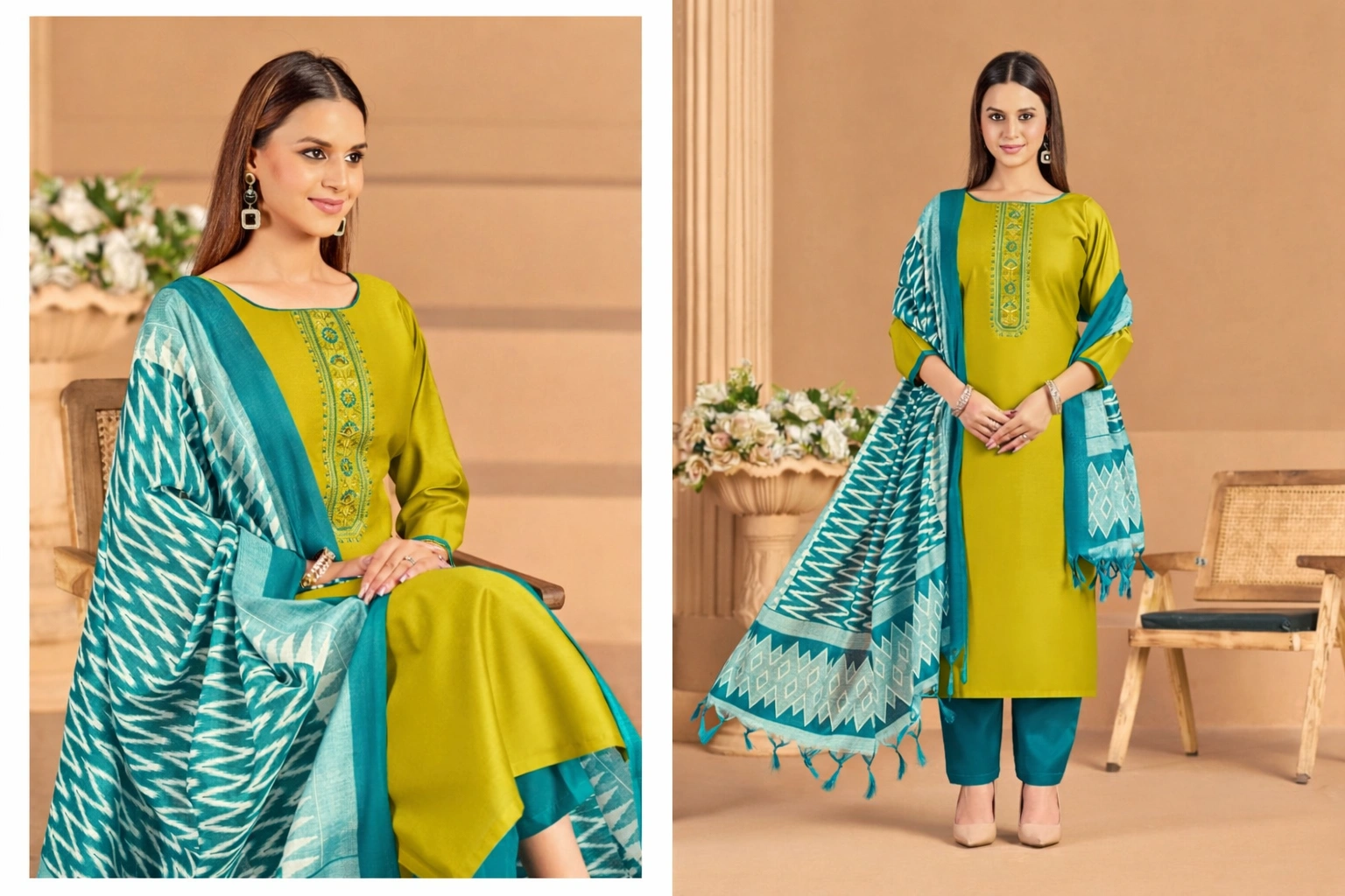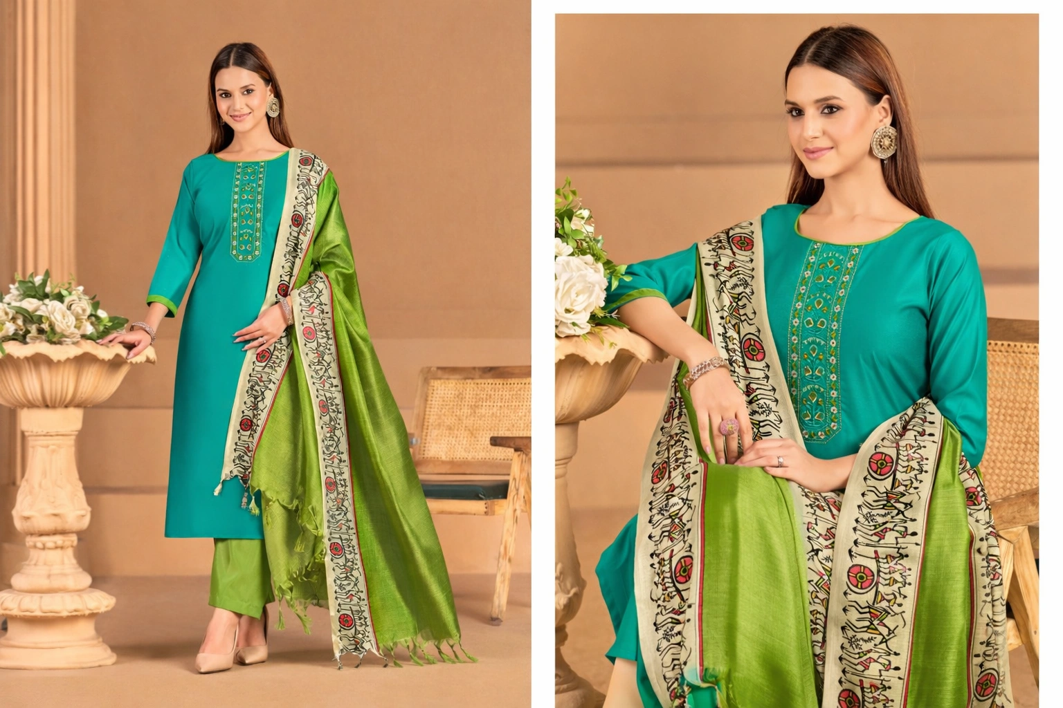 Roman Silk Salwar Suit with Bhagalpuri Dupatta – Teal and Lime Green
