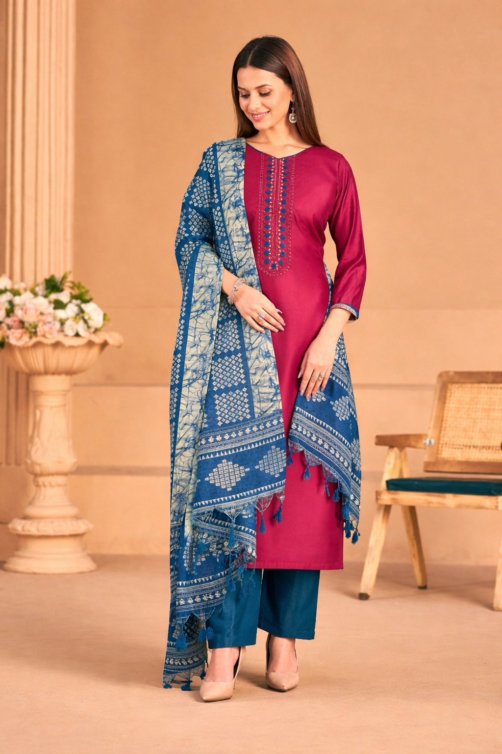 Roman Silk Salwar Suit with Bhagalpuri Dupatta – Wine and Blue