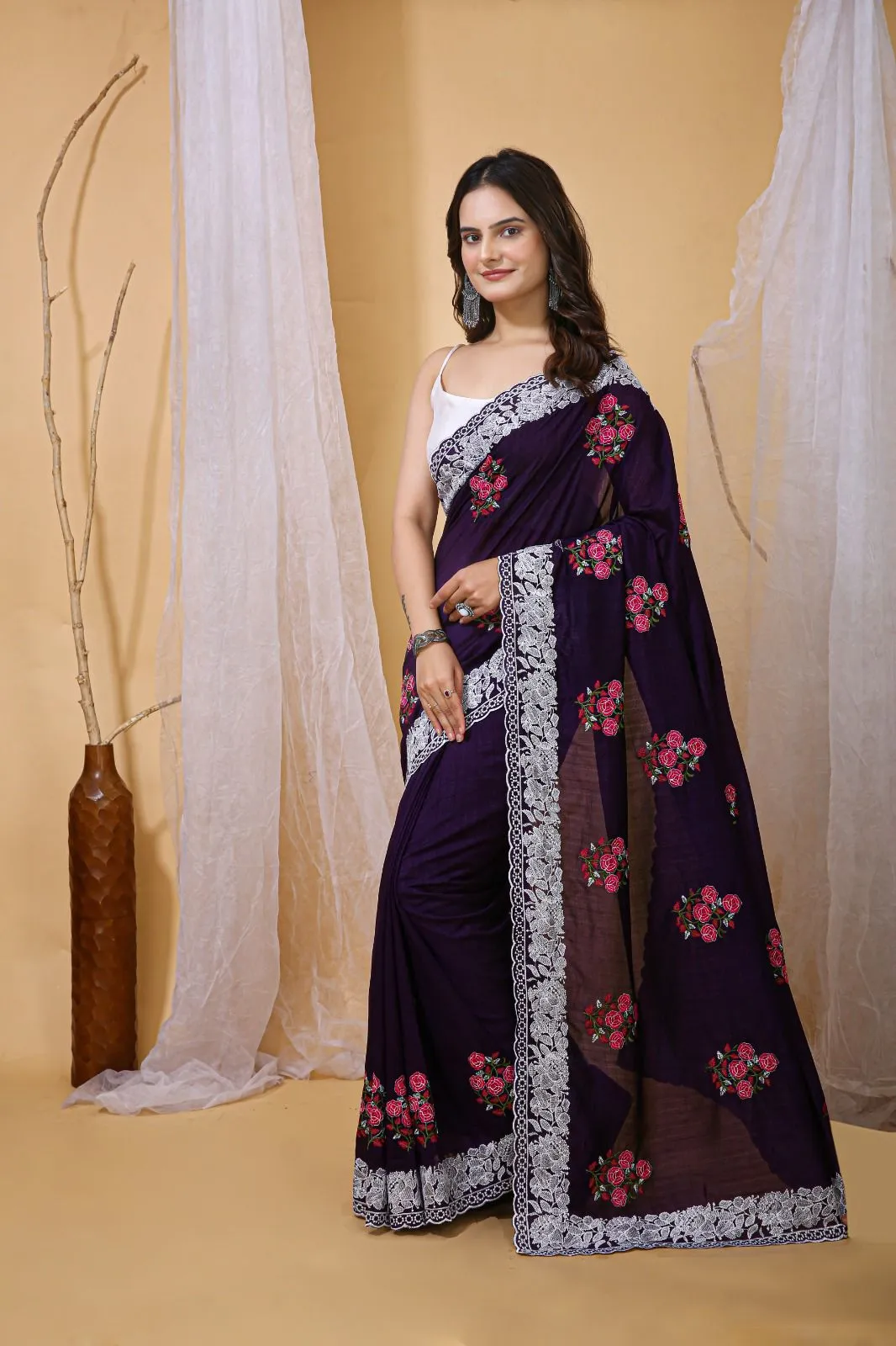 Classic Wine Purple Chinnon Saree with Antique Gold Border
