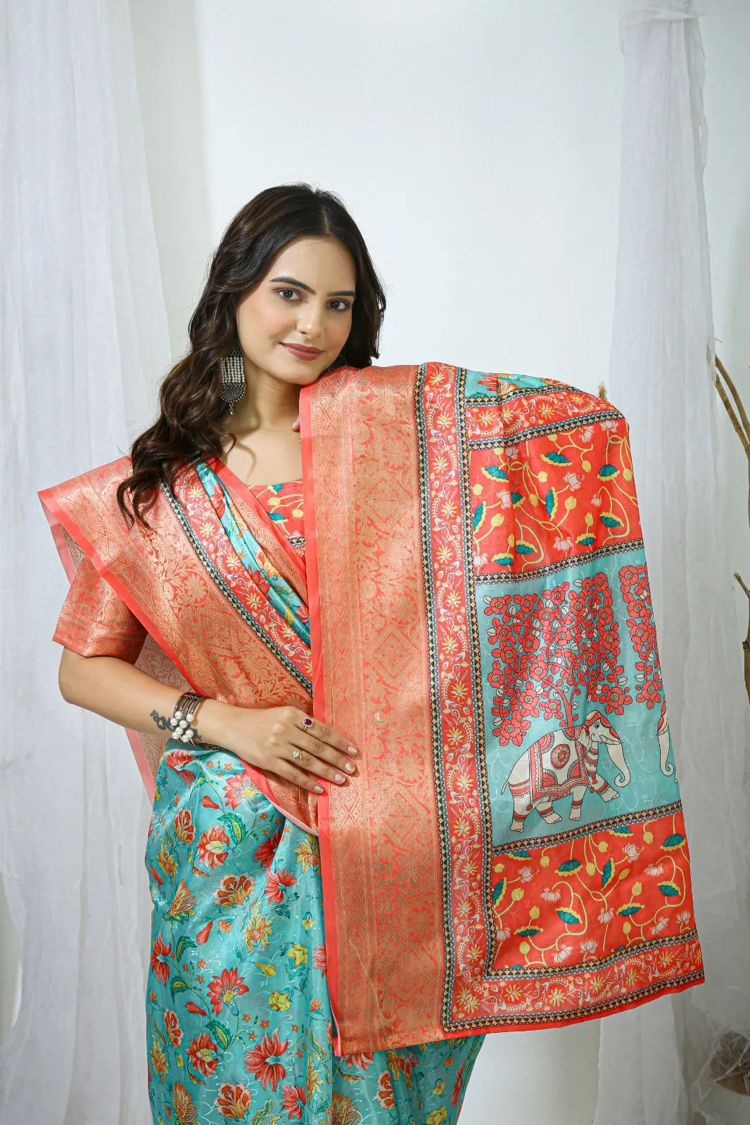 Sea Green Printed Soft Dola Cotton Saree with Peach Contrast Border