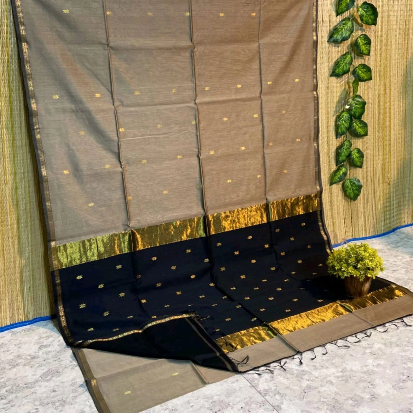 Handloom Maheshwari Cotton Silk Sarees – Beige with Black Pallu