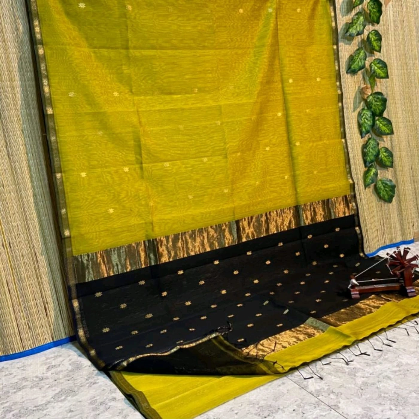 Handloom Maheshwari Cotton Silk Sarees – Mustard Yellow with Black Pallu
