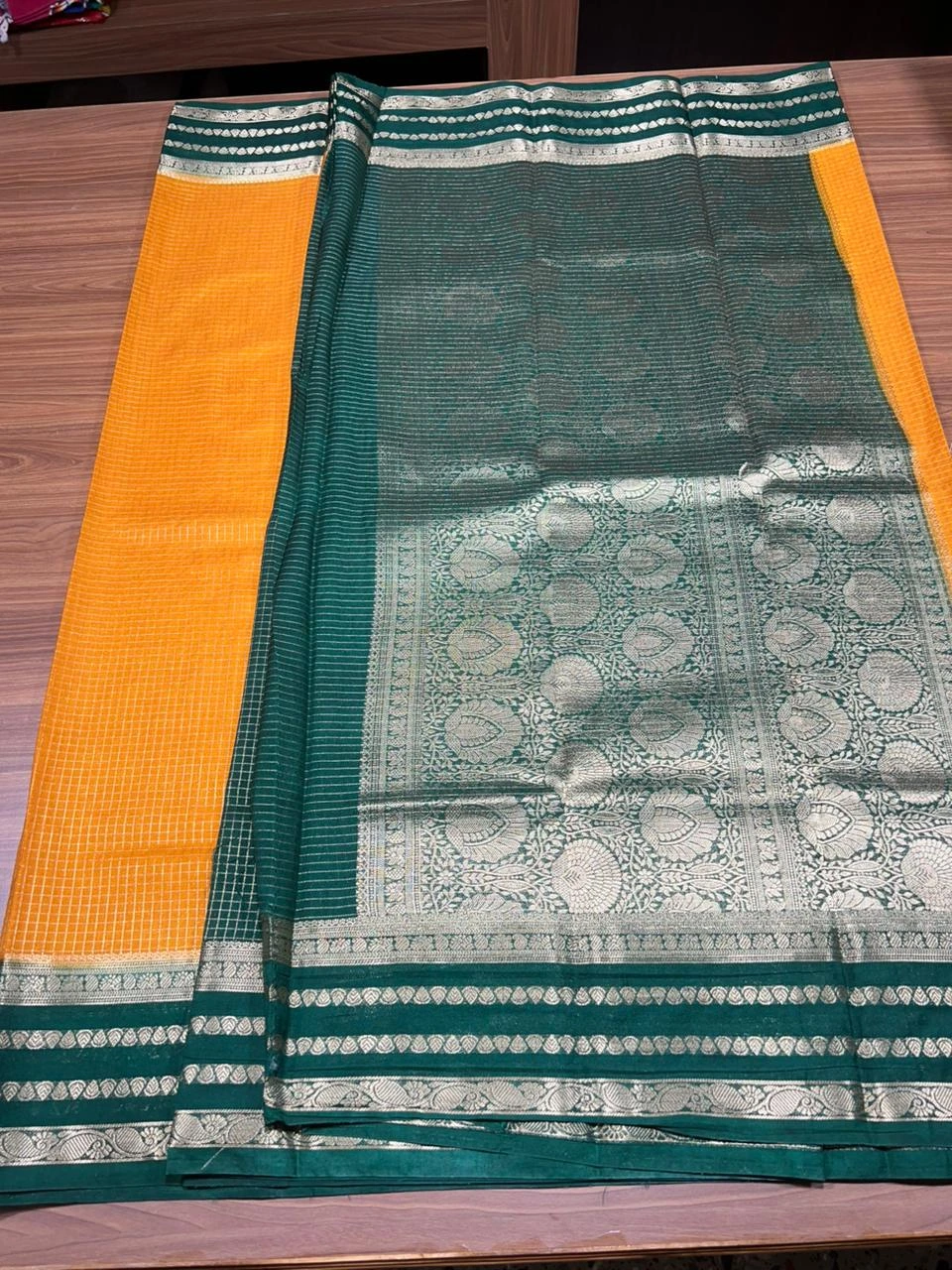 Ivory & Teal Checked Cotton Silk Saree with Zari Border