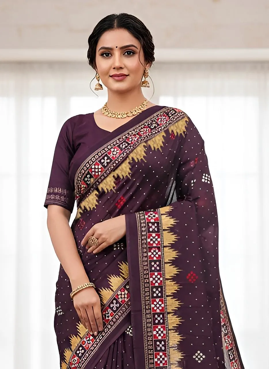 Royal Purple Linen Silk Saree with Bandhani Motifs & Statement Printed Pallu