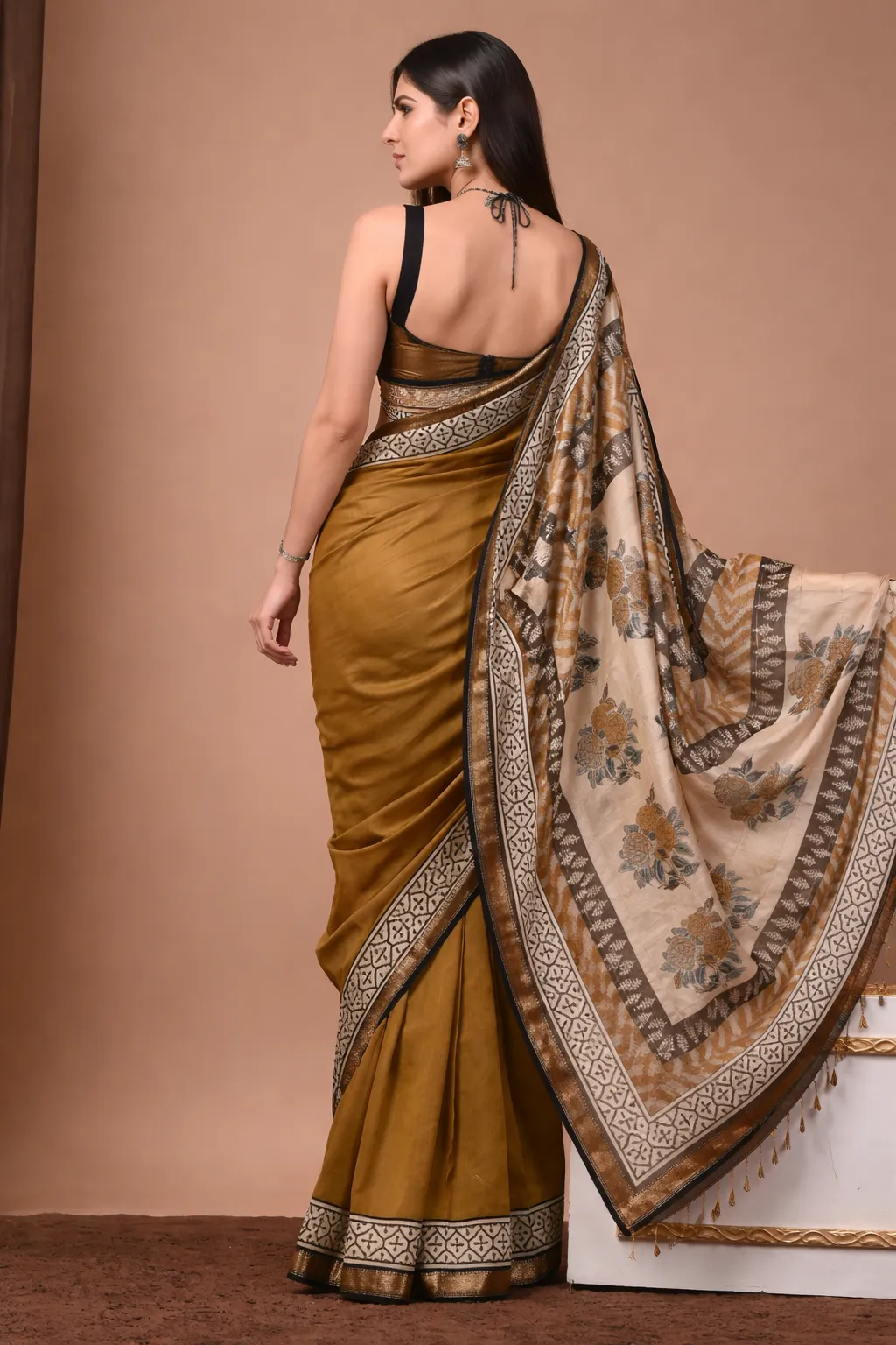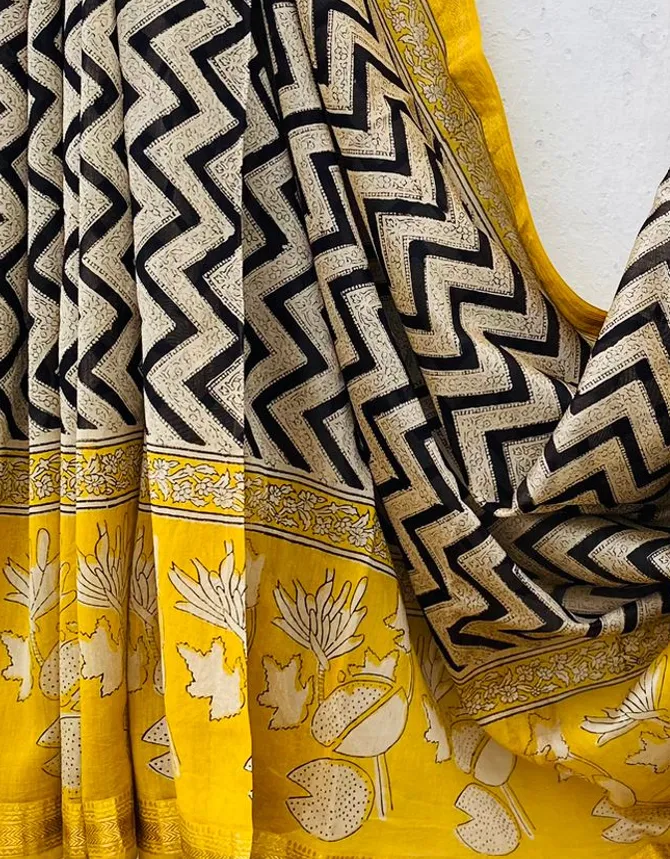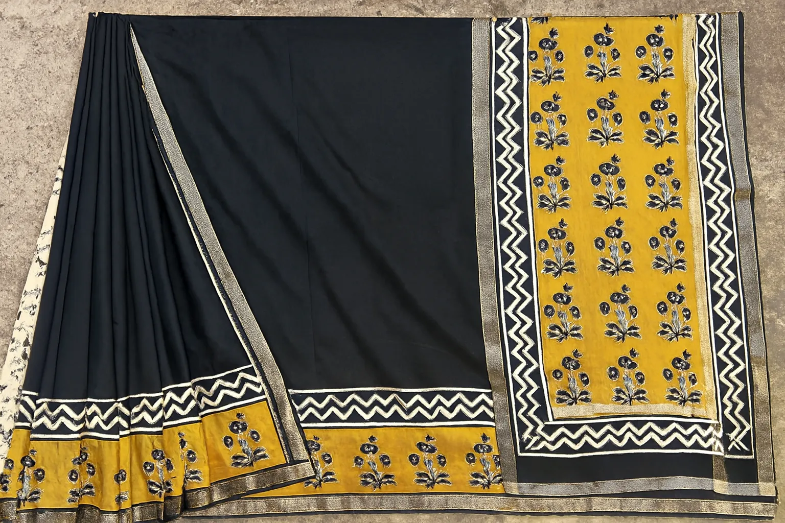 Traditional Handblock Printed Maheshwari Silk Sarees – Mustard Black