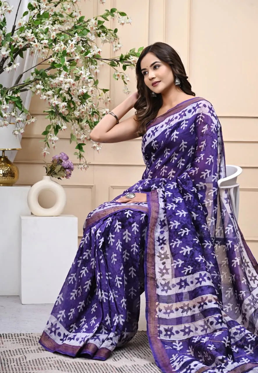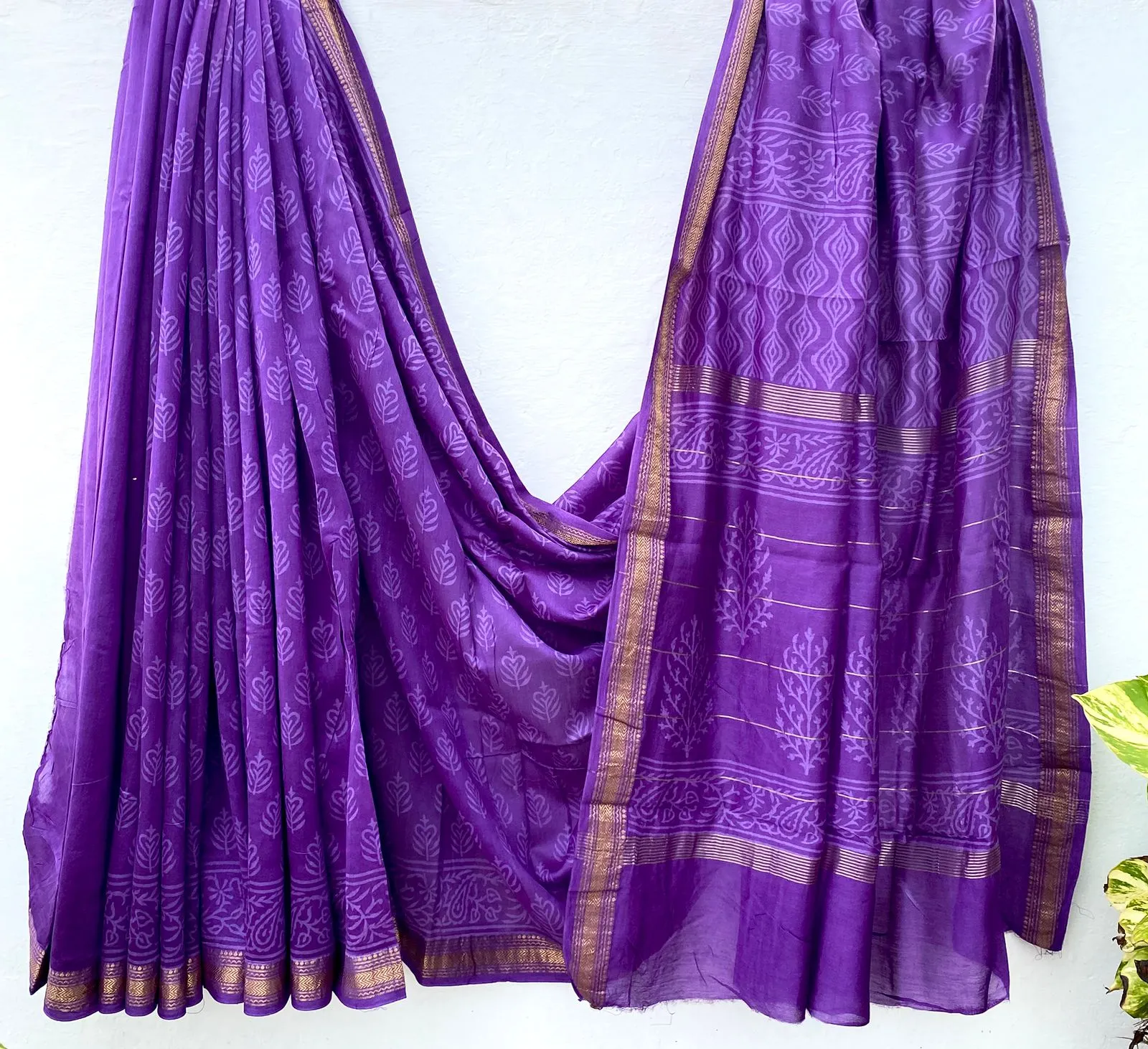Traditional Handblock Printed Maheshwari Silk Sarees – Rich Purple