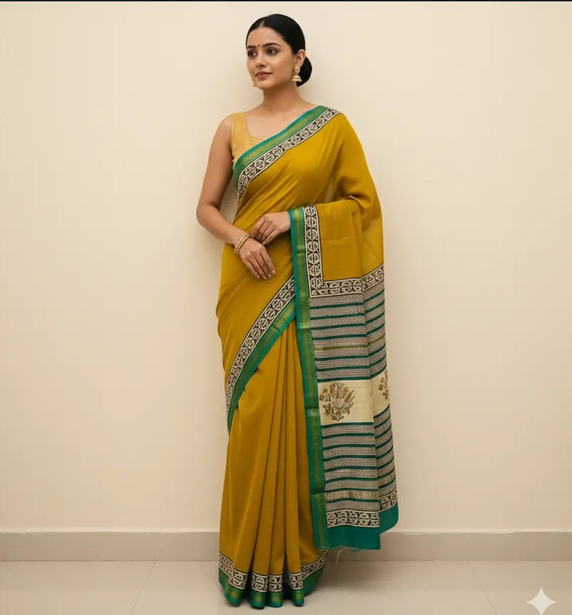 Traditional Handblock Printed Maheshwari Silk Sarees – Mustard