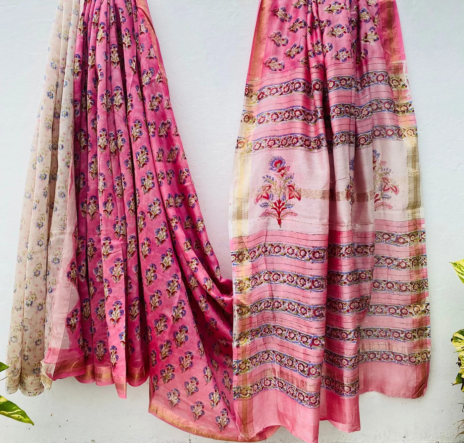 Traditional Handblock Printed Maheshwari Silk Sarees – Pink
