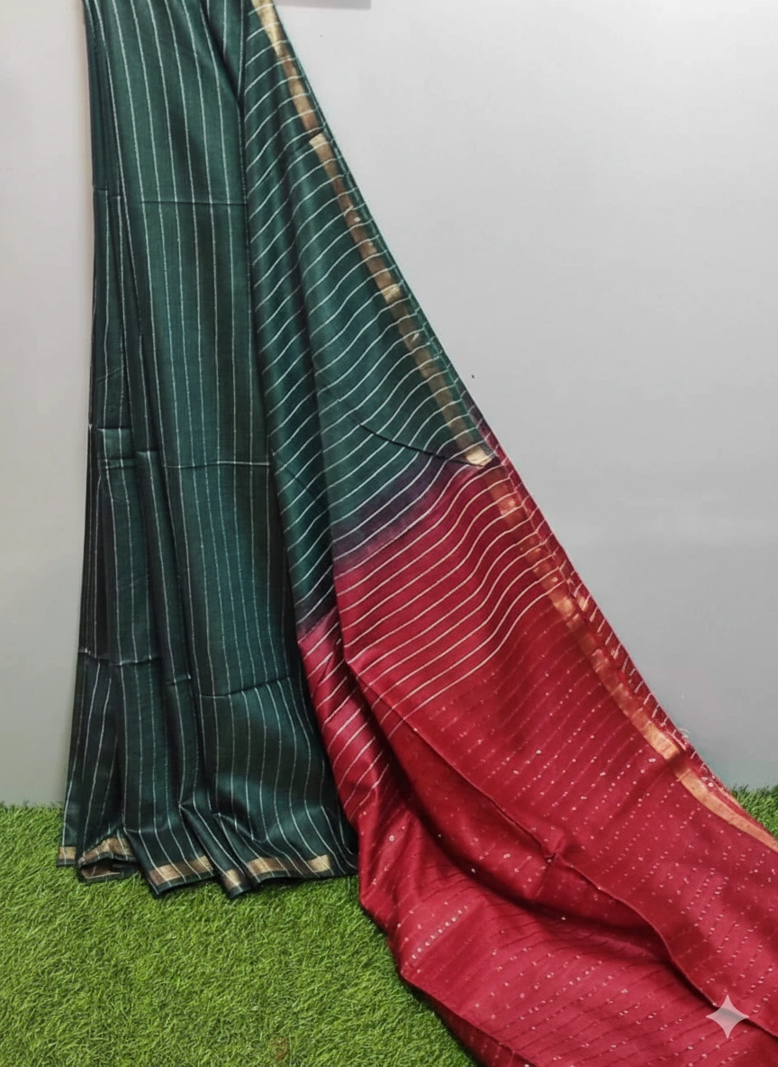 Kota Slub Sequence with Zari all over Saree – Deep Bottle Green with Maroon Pallu