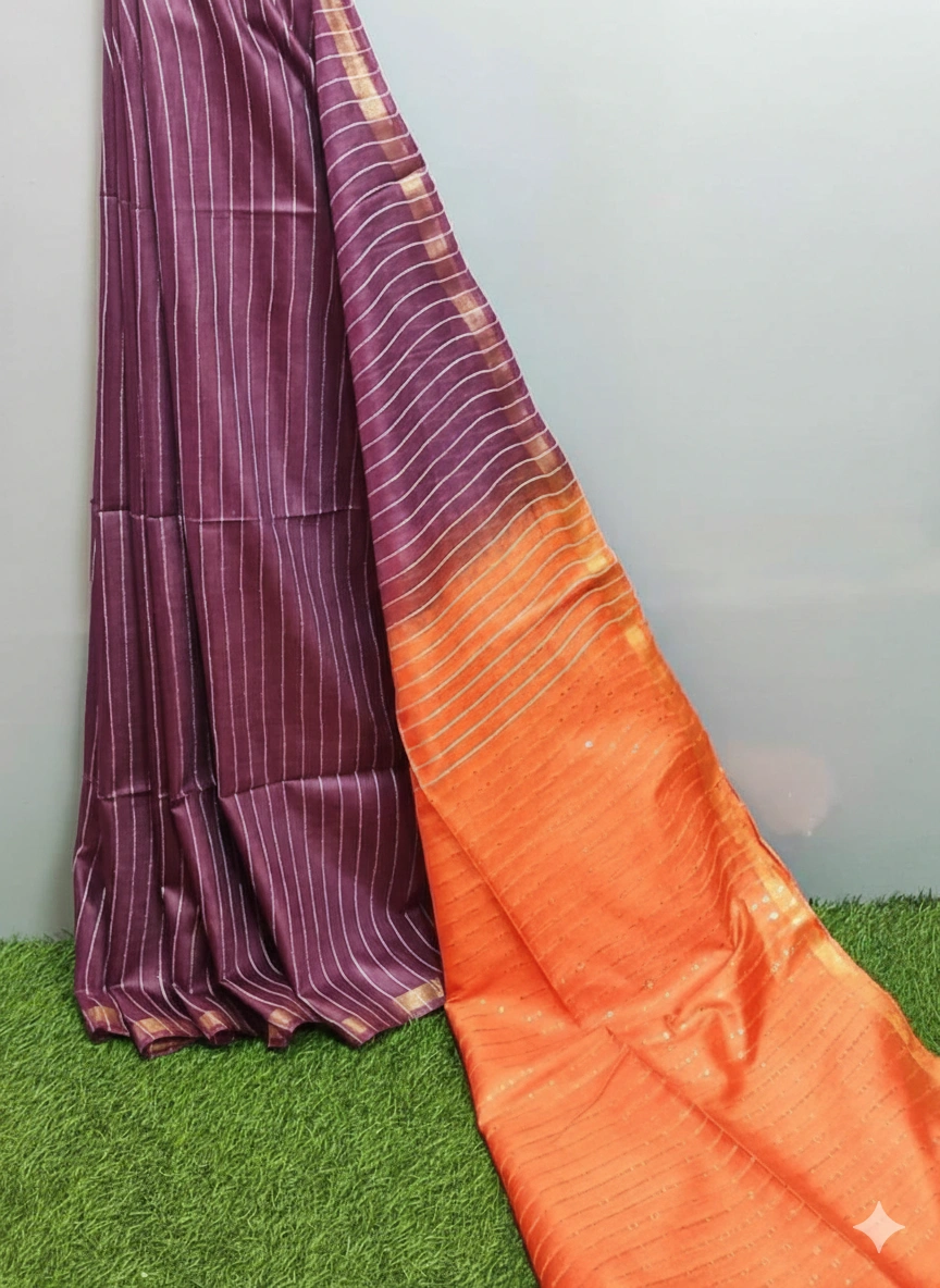 Kota Slub Sequence with Zari all over Saree – Plum Purple with Orange Pallu