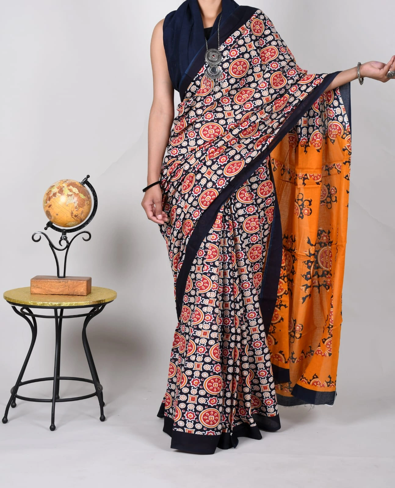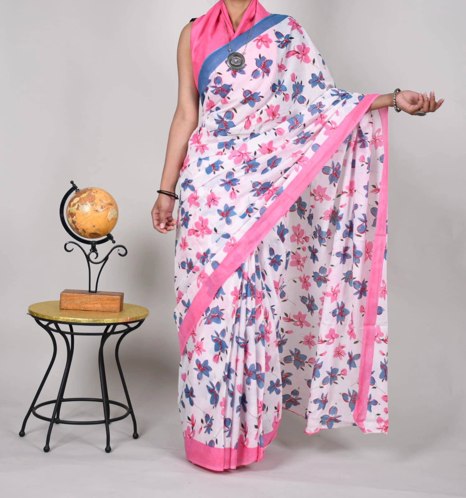 Bagru Block Print Cotton MulMul Sarees with Blouse – Navy Blue and Pink