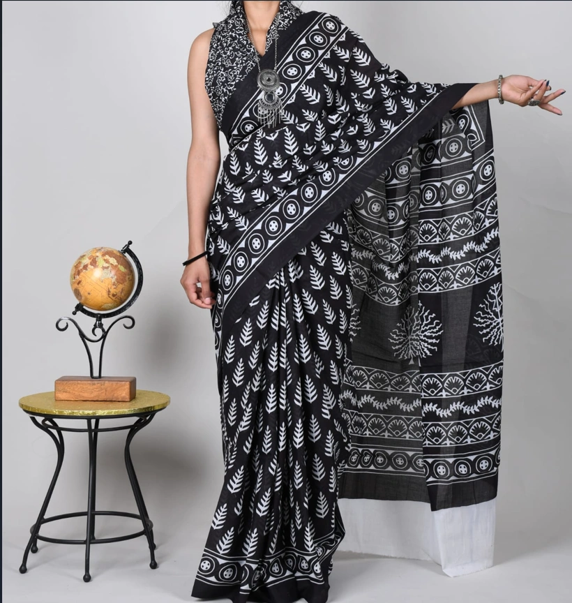 Elegant Bagru Block Print Cotton MulMul Sarees with Blouse – Black & White