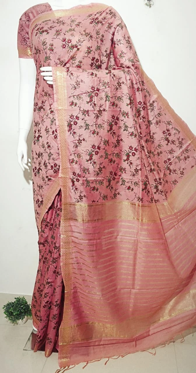 Elegant Ivory Floral Linen Digital Print Saree with Charcoal Grey Border