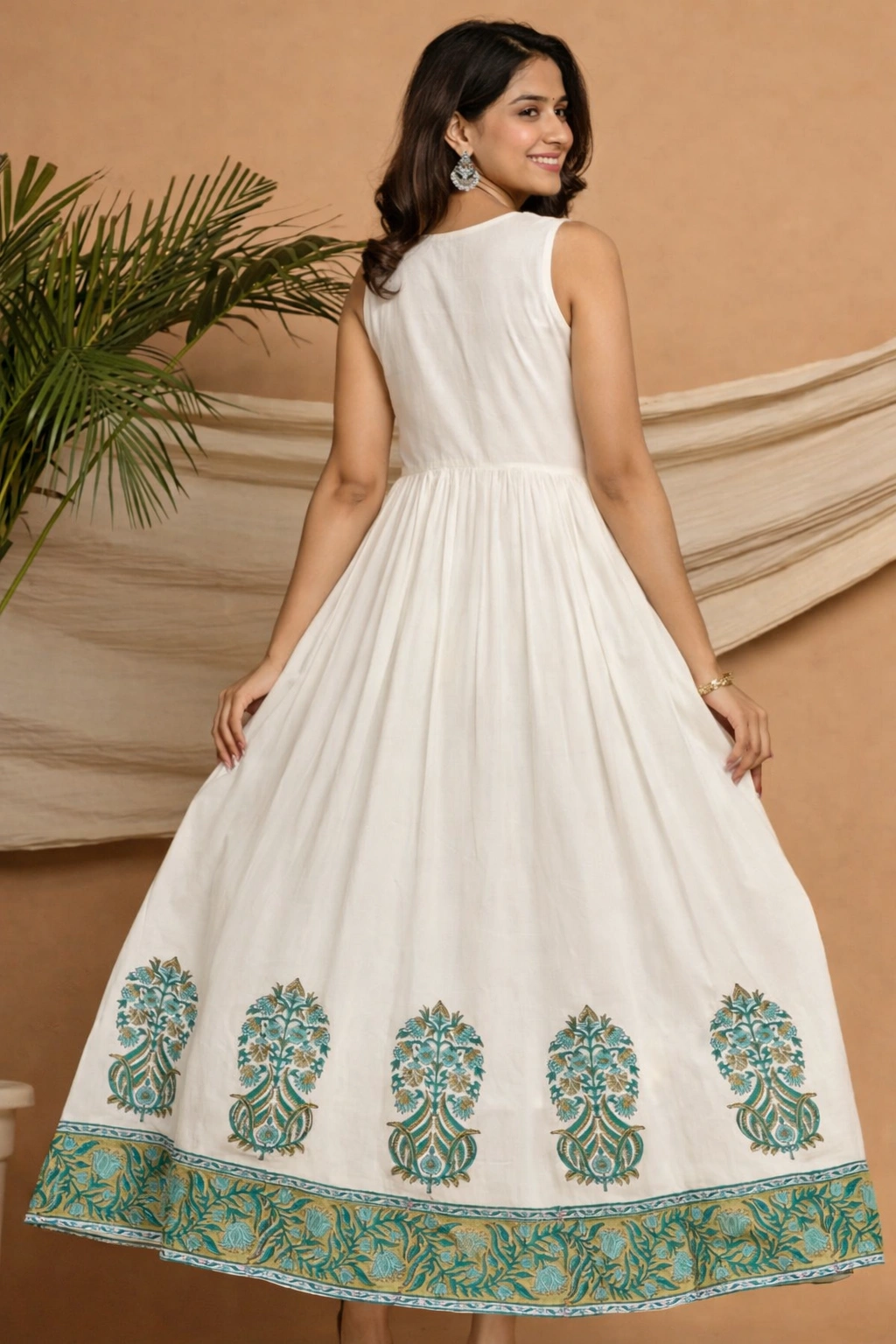 Motifs: Repeated traditional motifs placed evenly across the lower skirt for a refined ethnic appeal