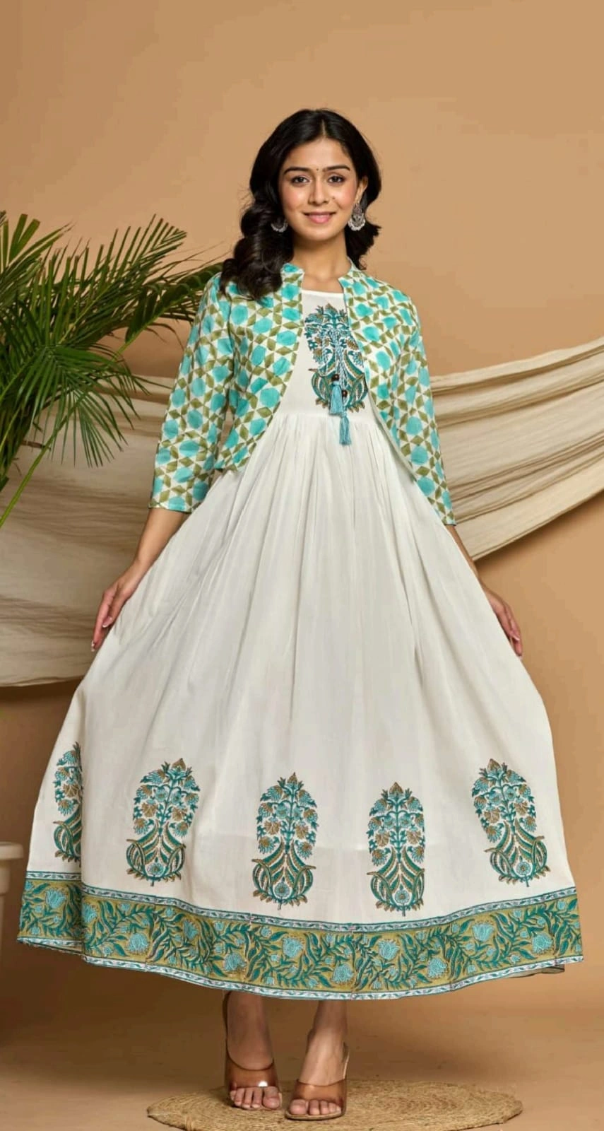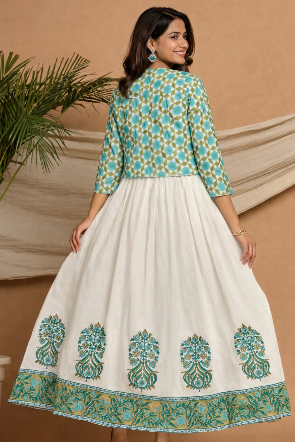 Jacket Layer: Stylish printed short jacket in teal and gold geometric patterns, adding a contemporary layered look