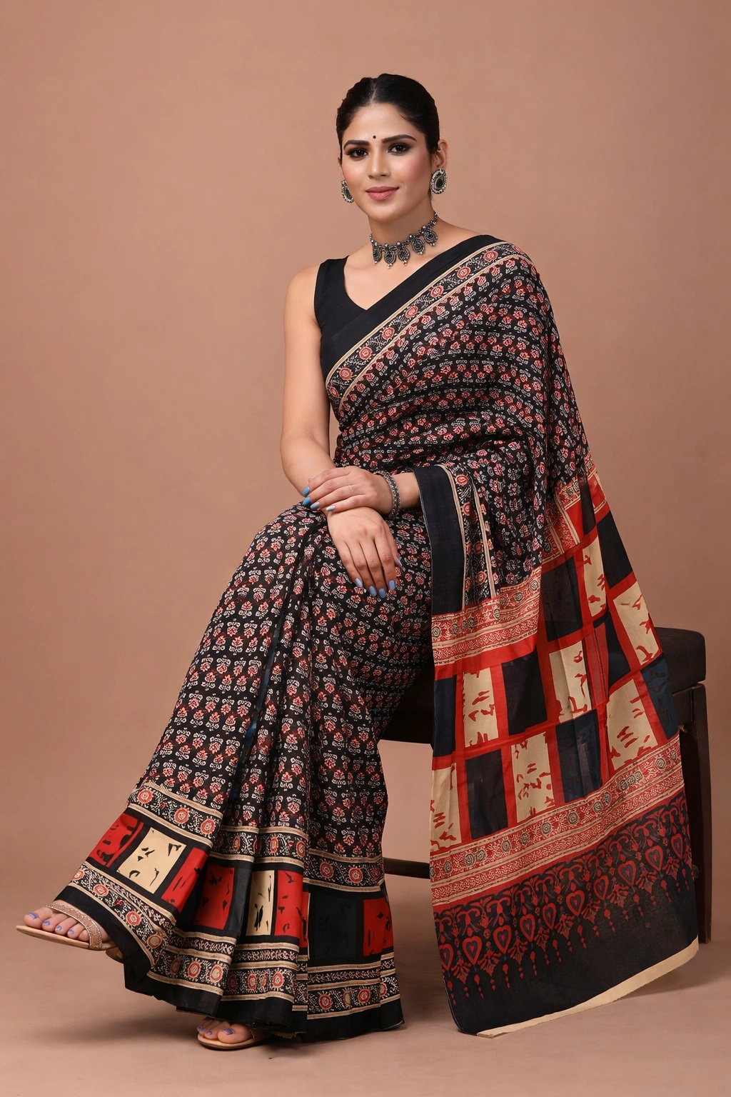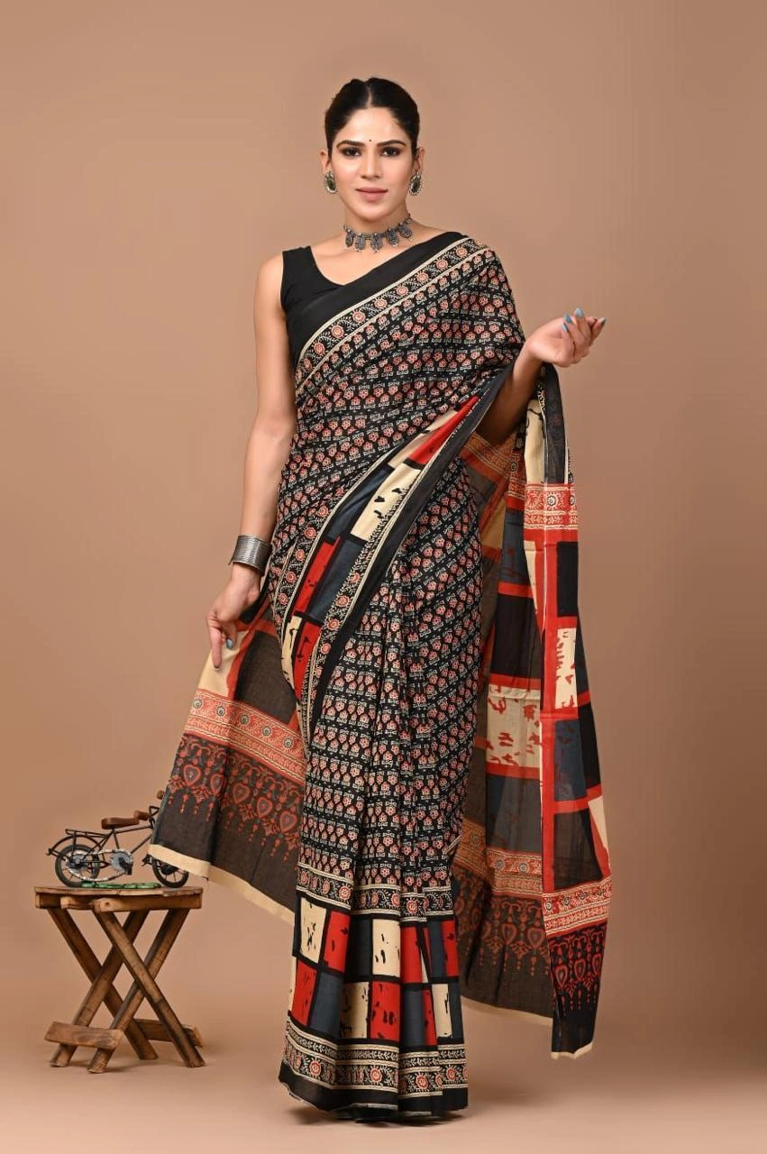 Classic Bagru Block Print Cotton MulMul Sarees with Blouse – Red & Beige