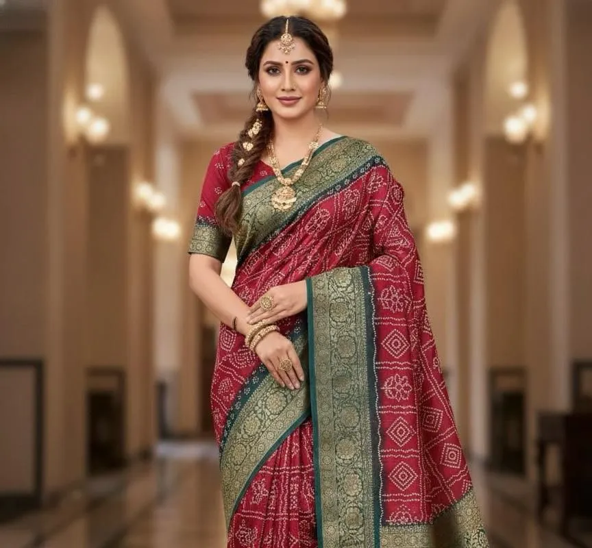 Classic Red Bandhani Print Saree with Teal Green & Antique Gold Border