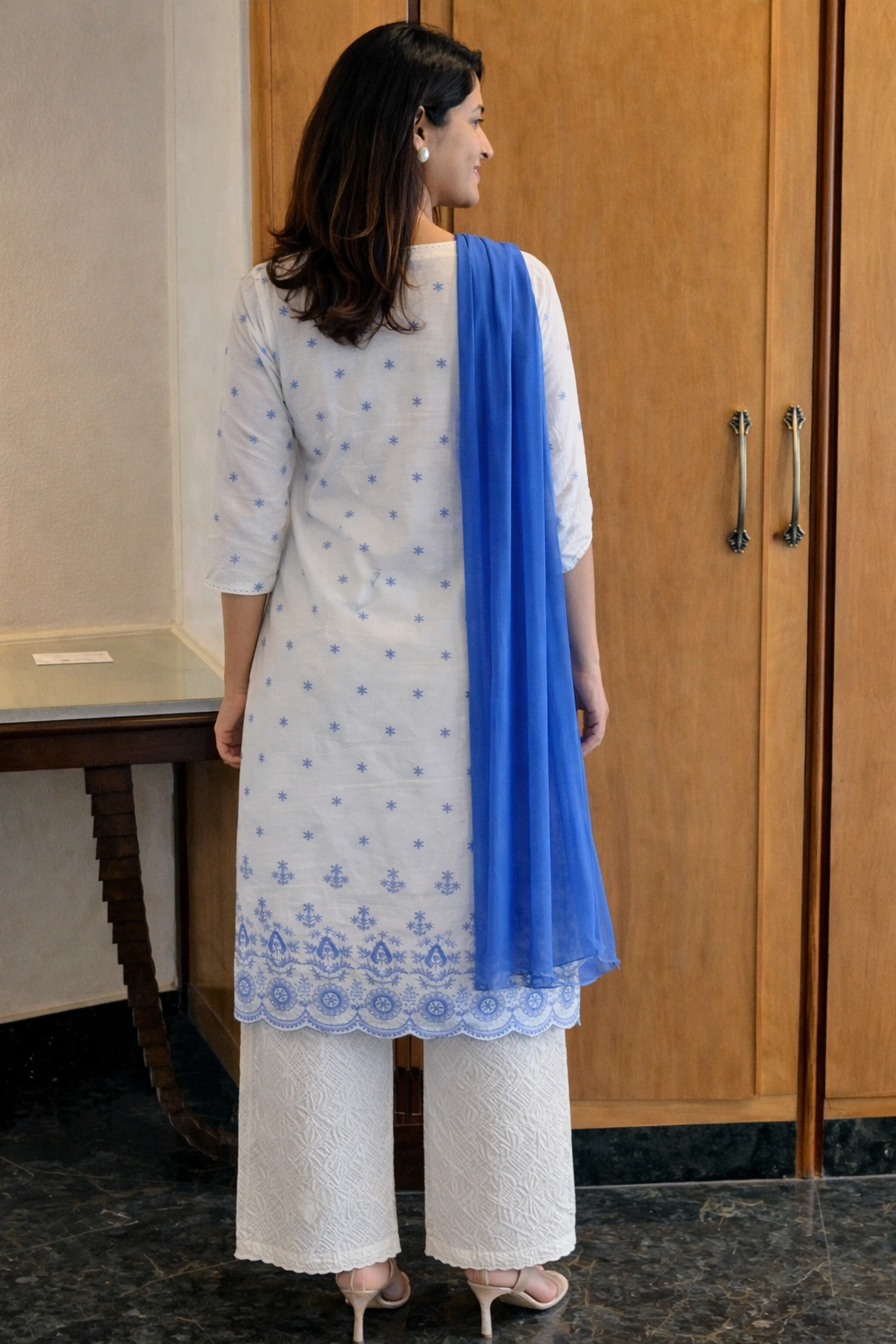 Premium cotton flex plazzo with intricate Schiffli embroidery, offering a classy yet breathable silhouette.
