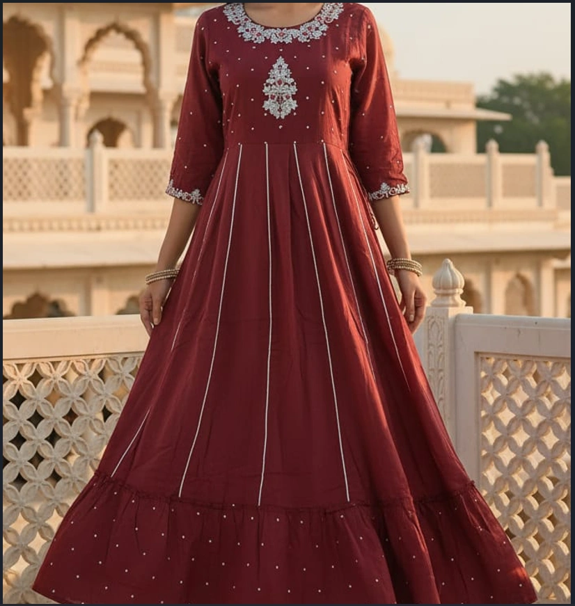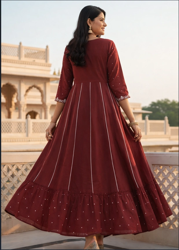 Silhouette: Flared Anarkali-style gown with a graceful, flowy fall