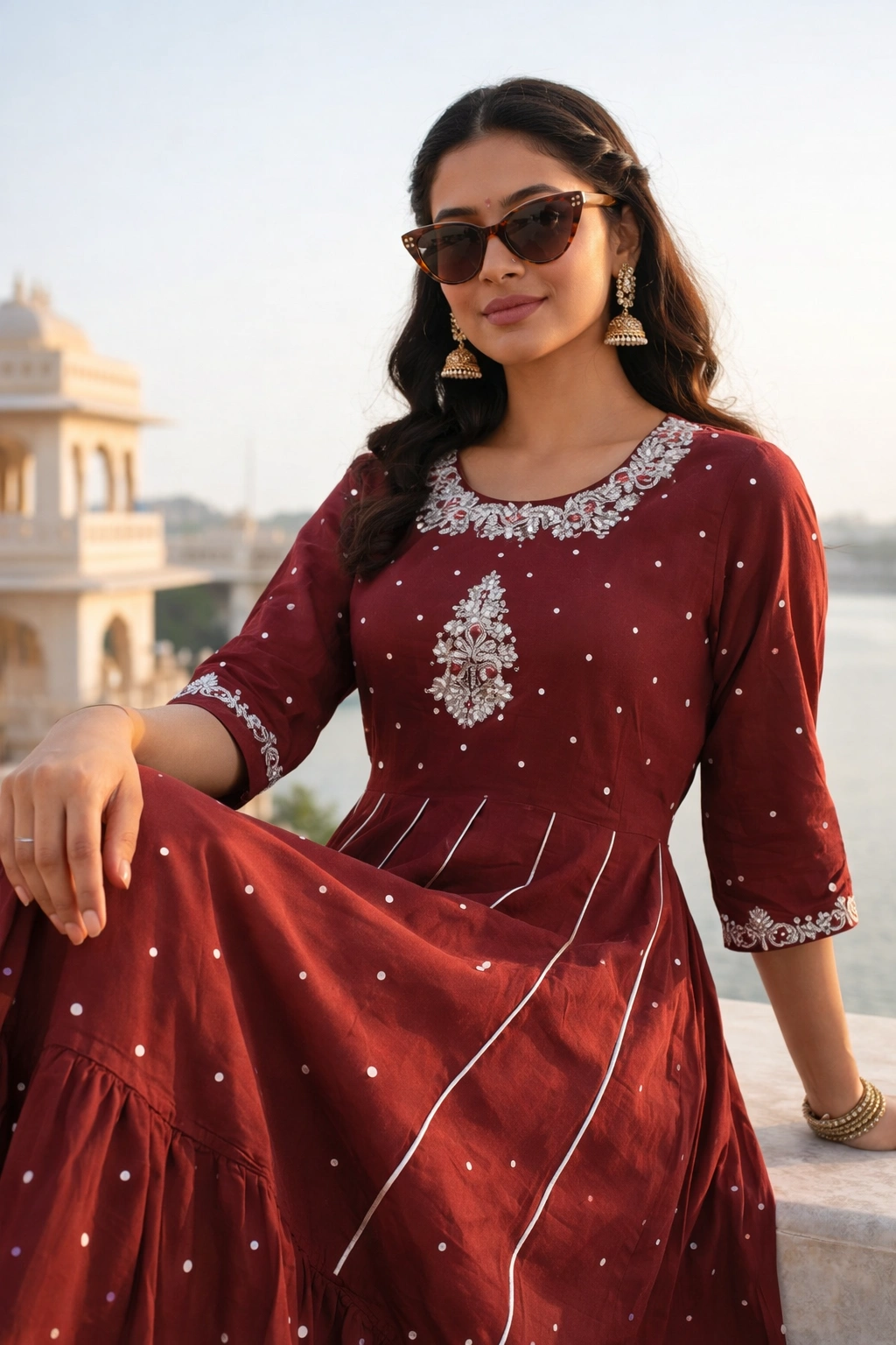 Hemline: Broad flared hem with subtle dotted detailing, adding texture and movement