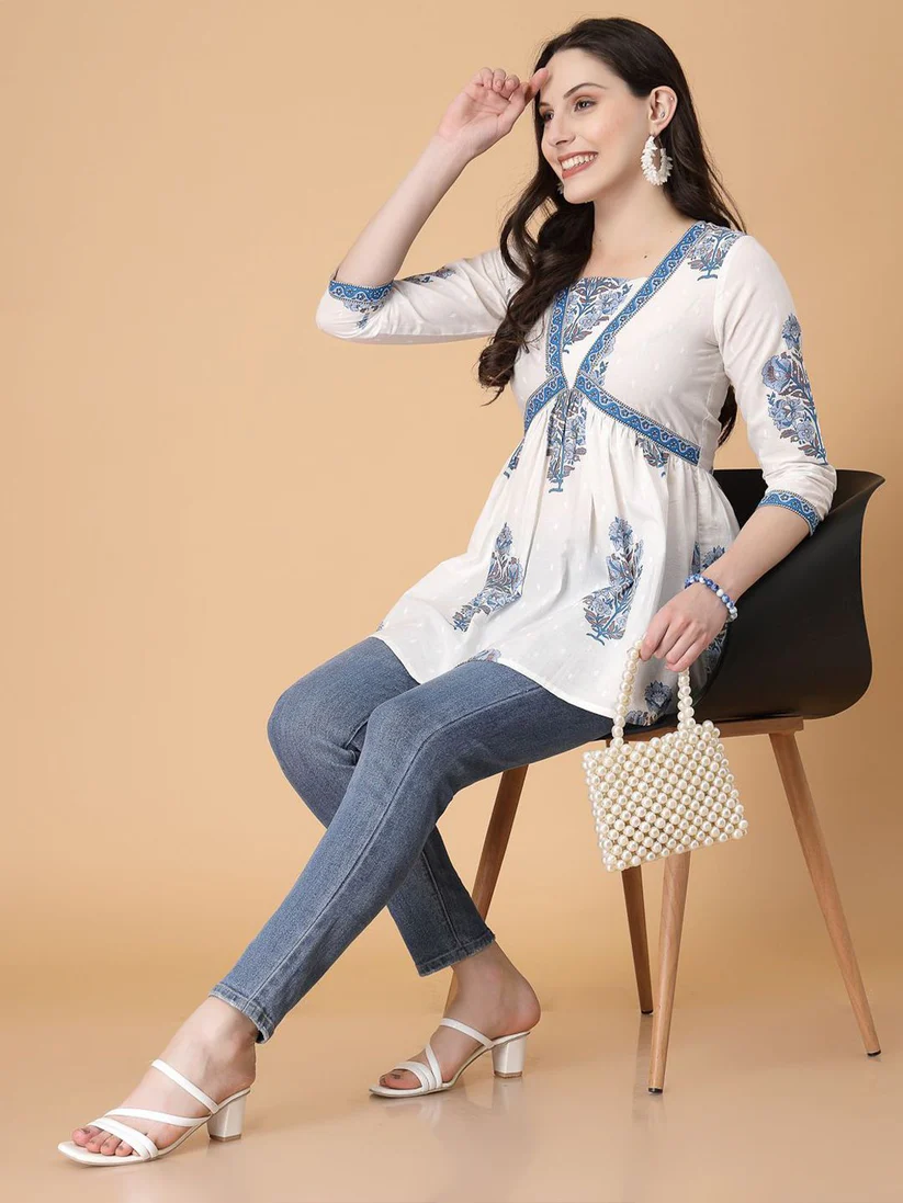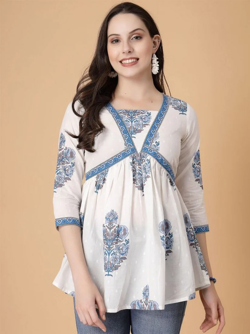 Blue Floral Printed Cotton Top