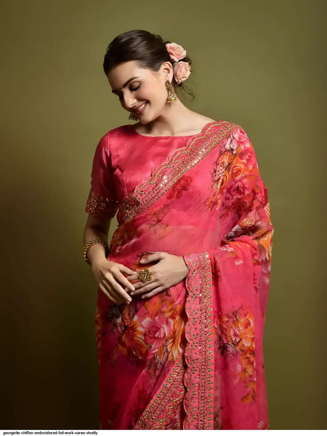 Saree Georgette chiffon with flower print with embroidered foil work