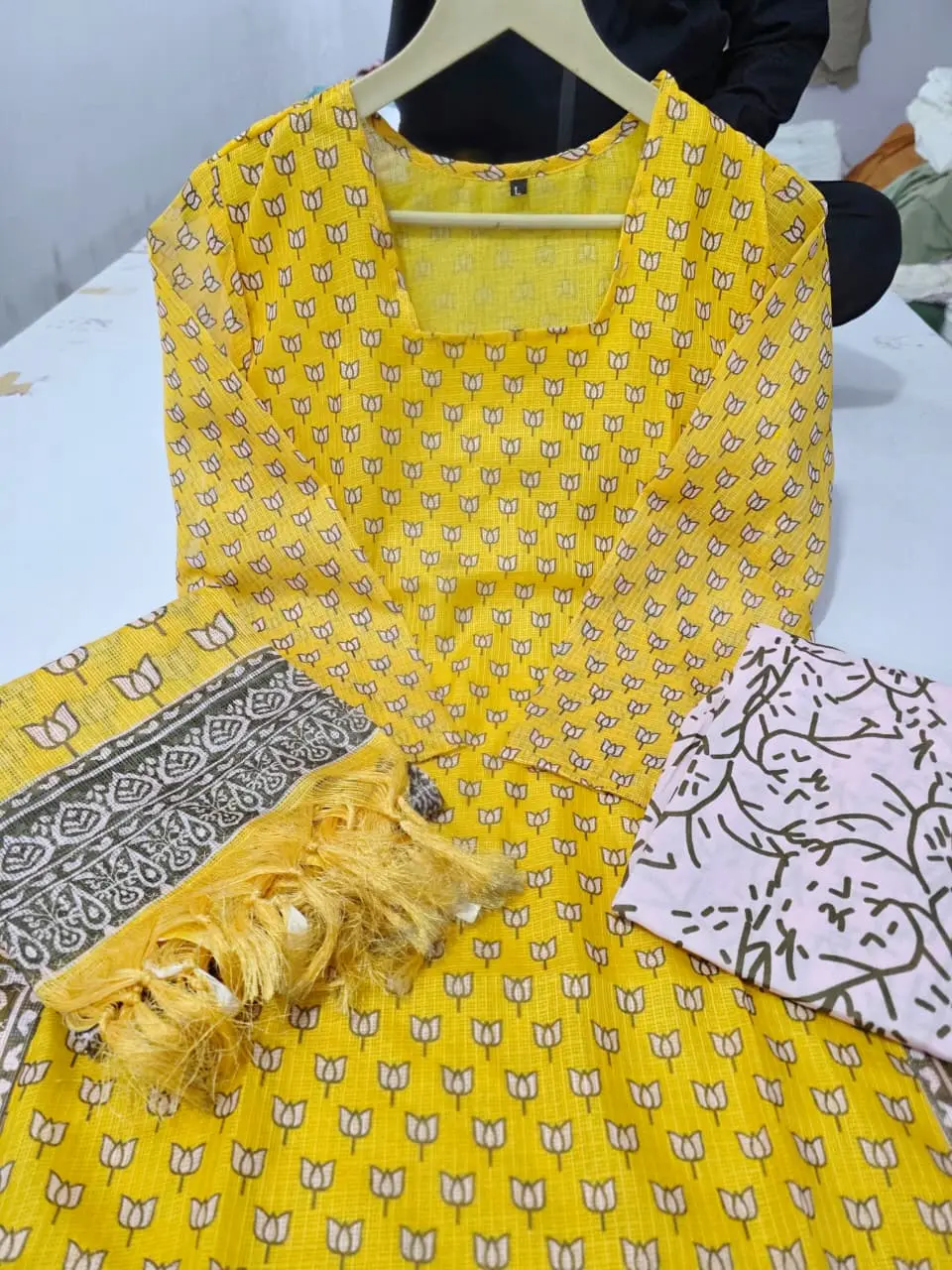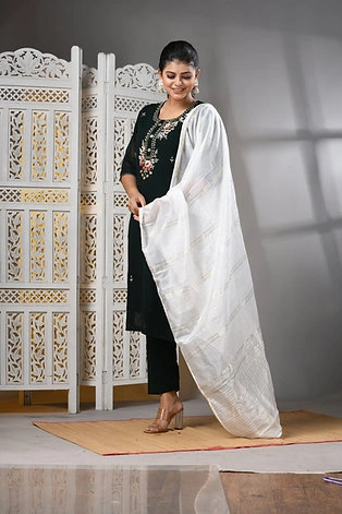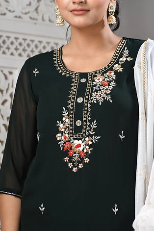 Have used georgette silk to make the kurti and pant. kurti length is knee length with 3 quarter sleeves. The length of the pant is ankle length and the closure type is elasticated waistband with drawstring closure. Zari works are available around the neck line and the front side. The material of the dupatta is silk and there are sequins in the dupatta.