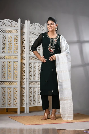Hand Woven Georgette 3PC Set in Bottle Green with Zari Work