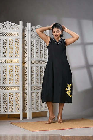 Have used slab khadi cotton to make this one piece. This V-Neck sleeveless one piece has hand woven thread work flower designs.