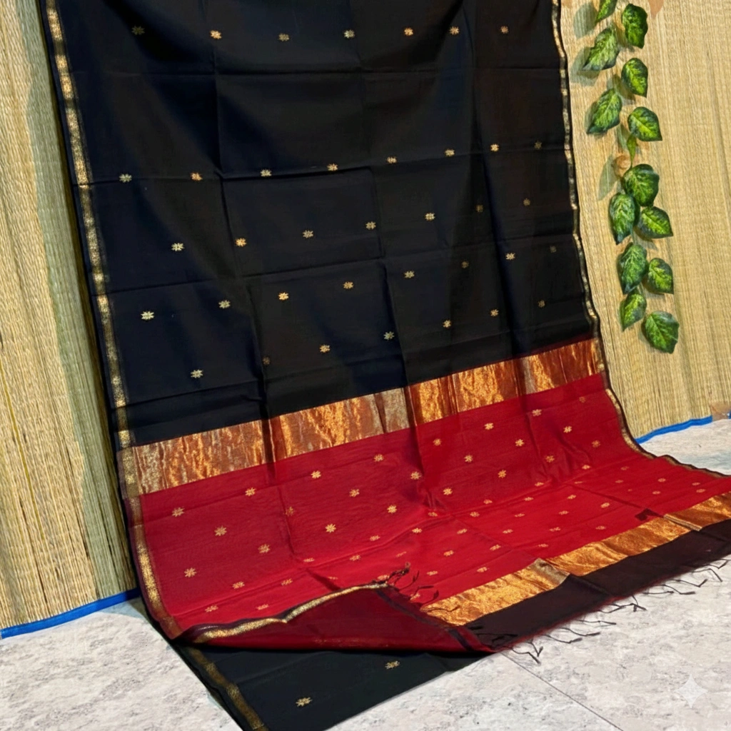 Handloom Maheshwari Cotton Silk Sarees – Black with Maroon Pallu