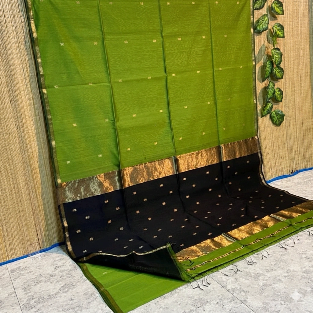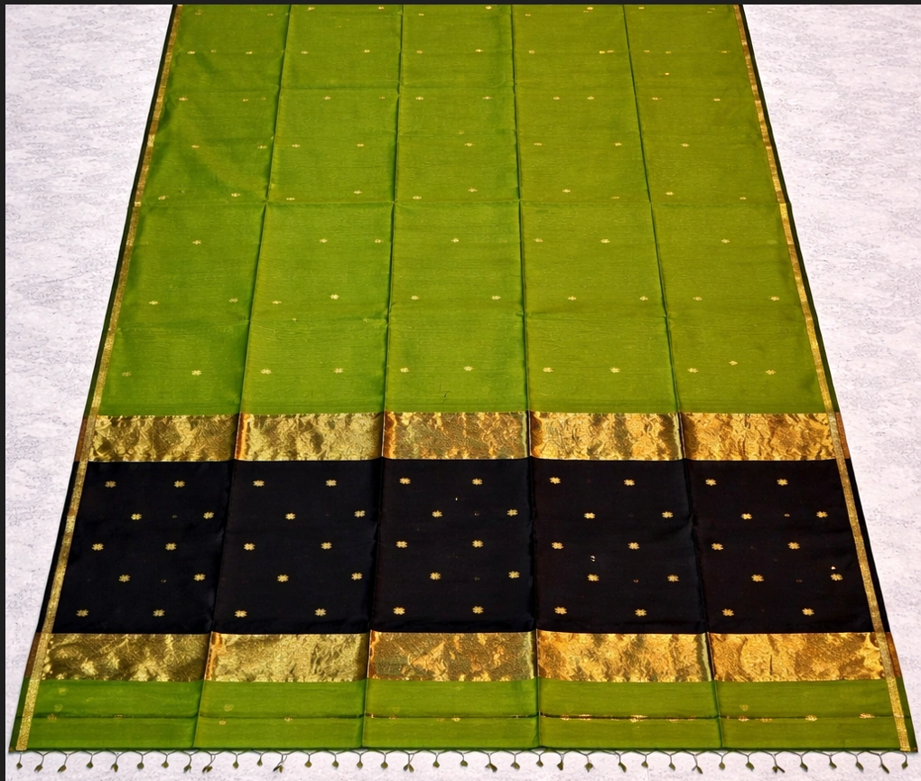 Handloom Maheshwari Cotton Silk Sarees – Green with Black Pallu