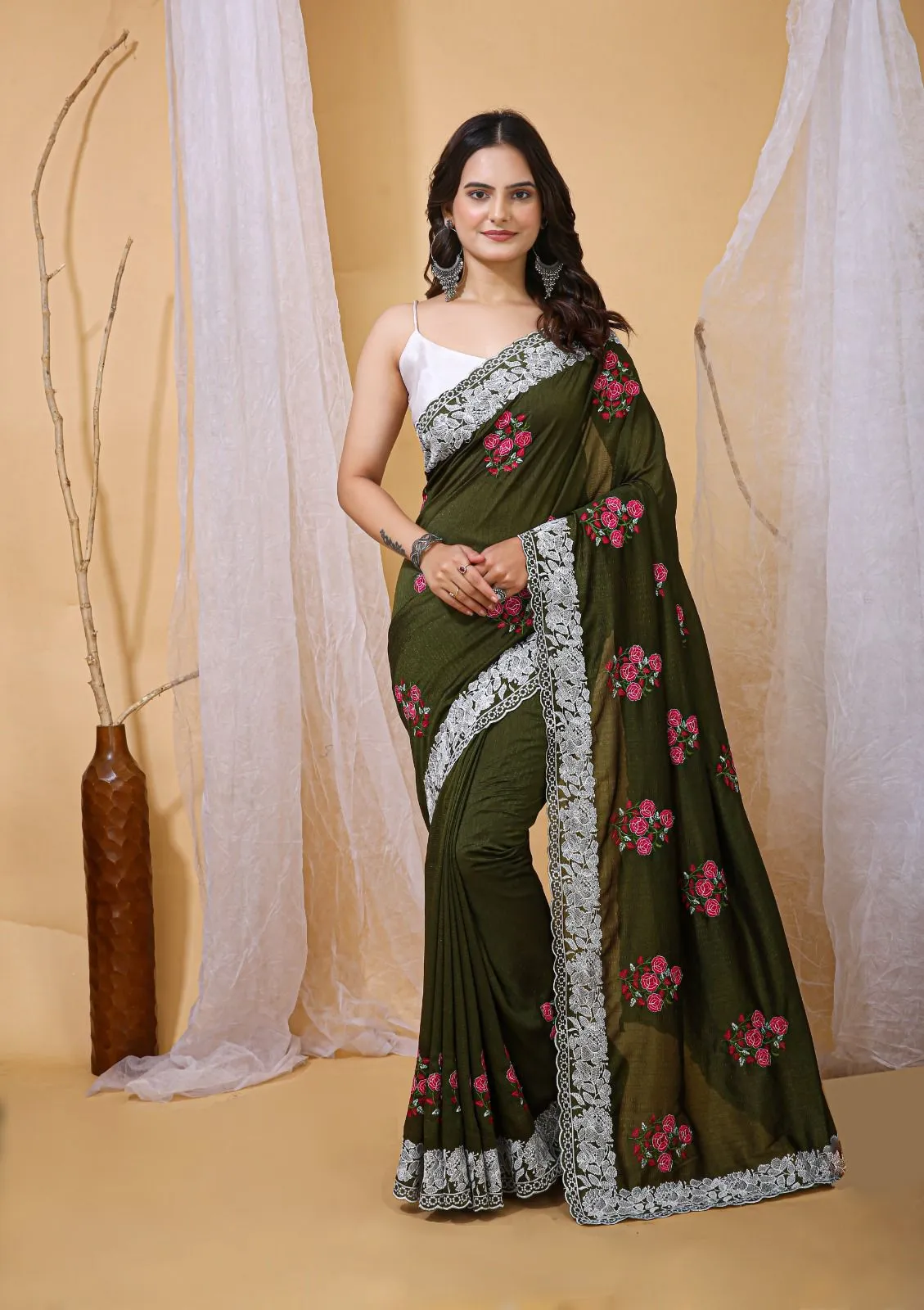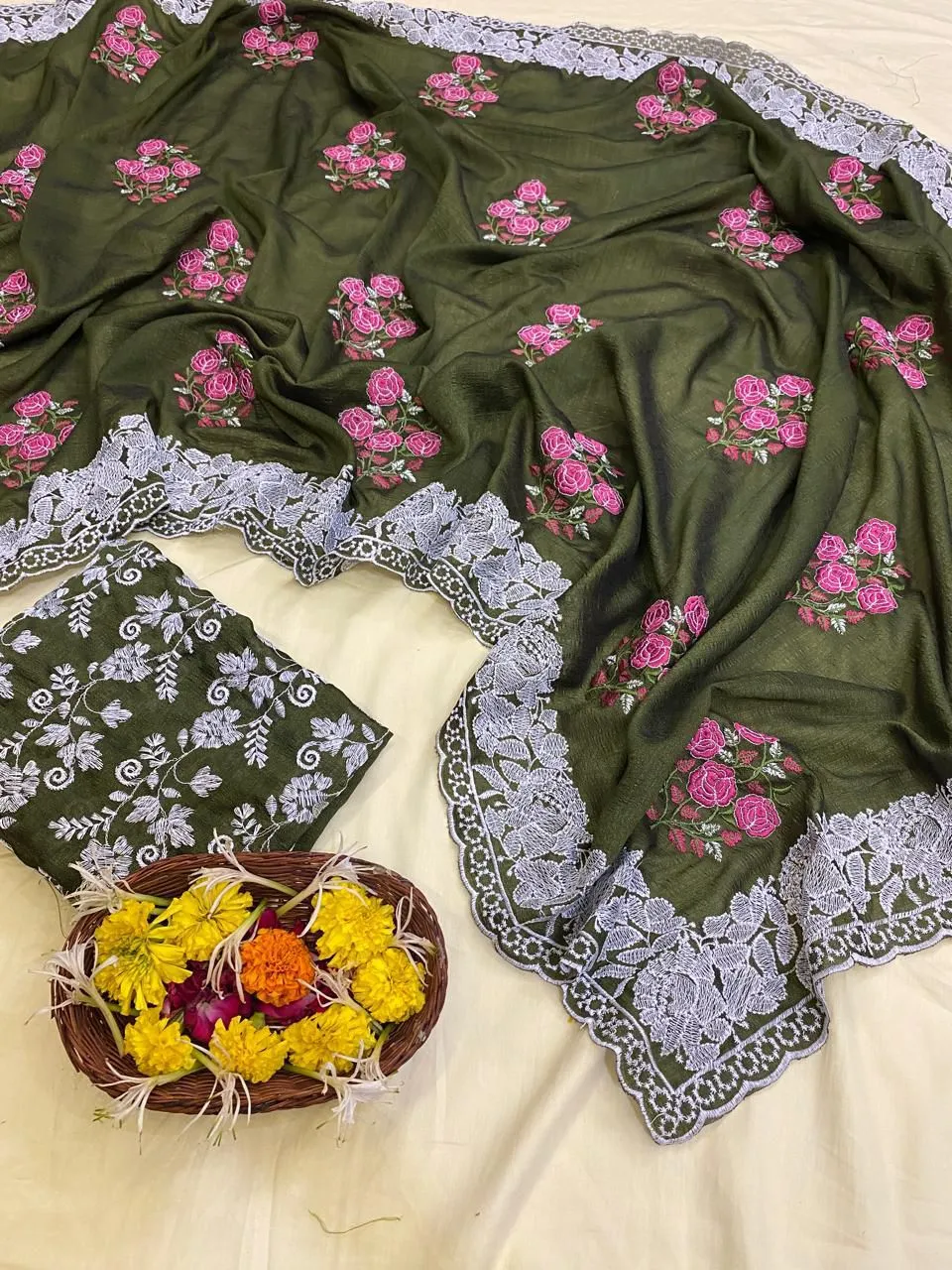 Enhance your ethnic collection with this elegant olive green saree crafted in a soft, flowy fabric. The saree features delicate pink floral embroidery beautifully scattered across the body, adding a graceful and feminine charm. Finished with a stunning white lace border that elevates its overall appeal, this saree offers a perfect blend of subtle elegance and modern style. Ideal for festive gatherings, casual celebrations, and day functions, it’s a refined choice for effortless sophistication.