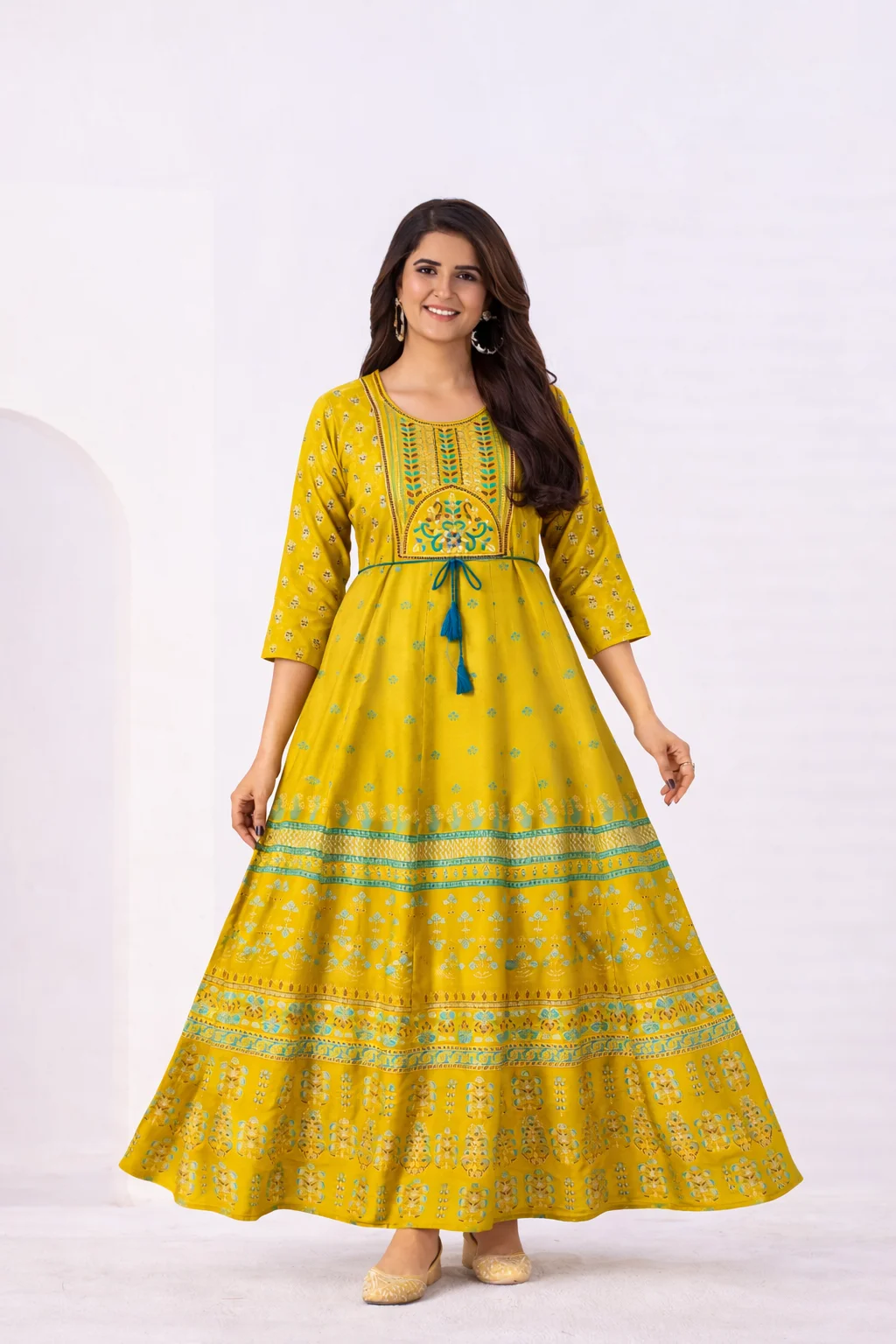 Rayon Anarkali Gown Classic Neck Embroidery with Belt – Peach