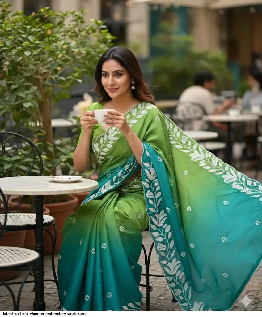 Pure soft silk chinon saree in a double colour shaded with Multi embroidery thread work in saree Paired with soft chinon silk blouse of same color of saree with embroidery work.