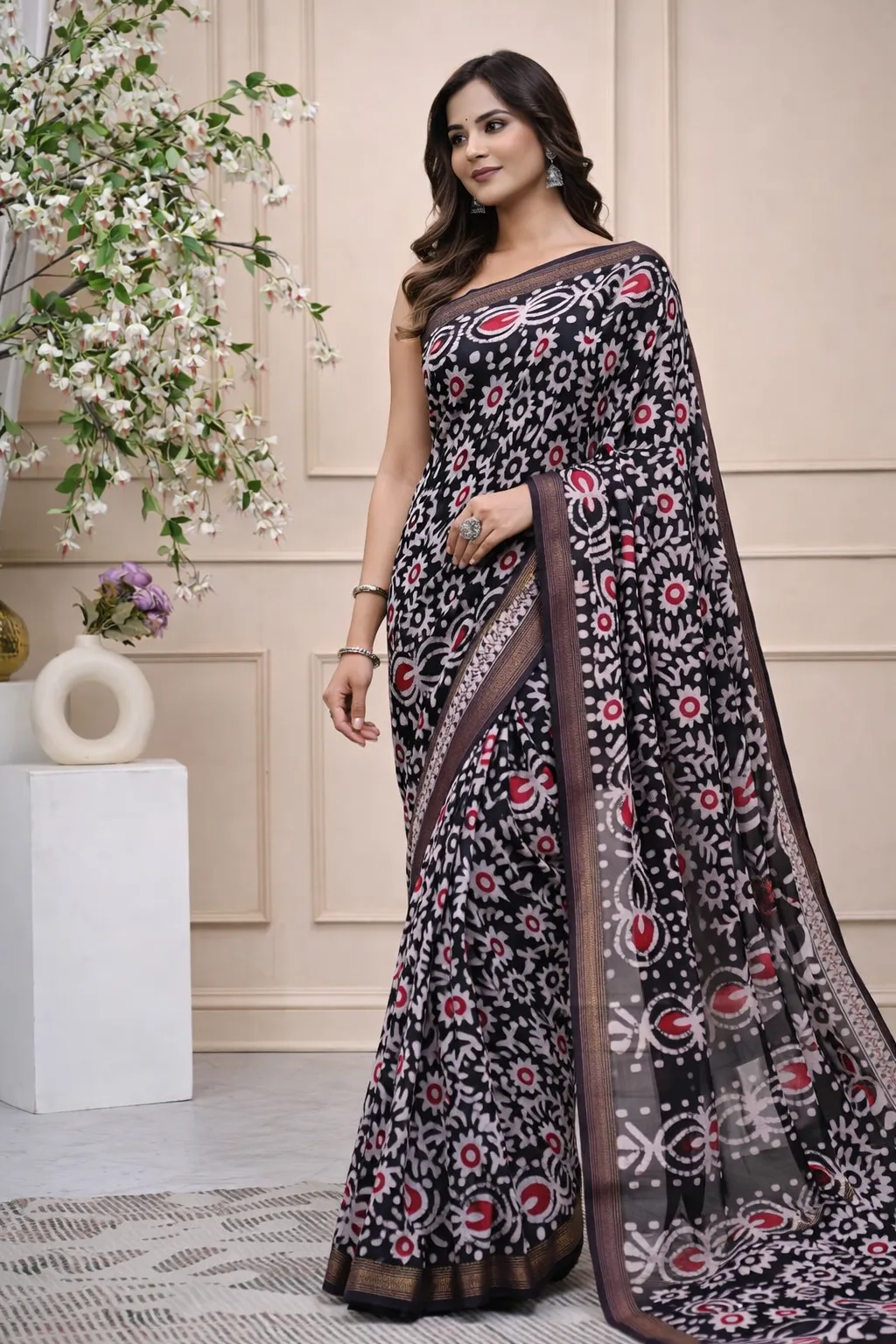 A stylish black saree featuring bold red and white traditional motifs, complemented by a subtle contrasting border and an artistically patterned pallu. Elegant yet contemporary, it’s ideal for festive evenings, cultural events, and statement occasions.