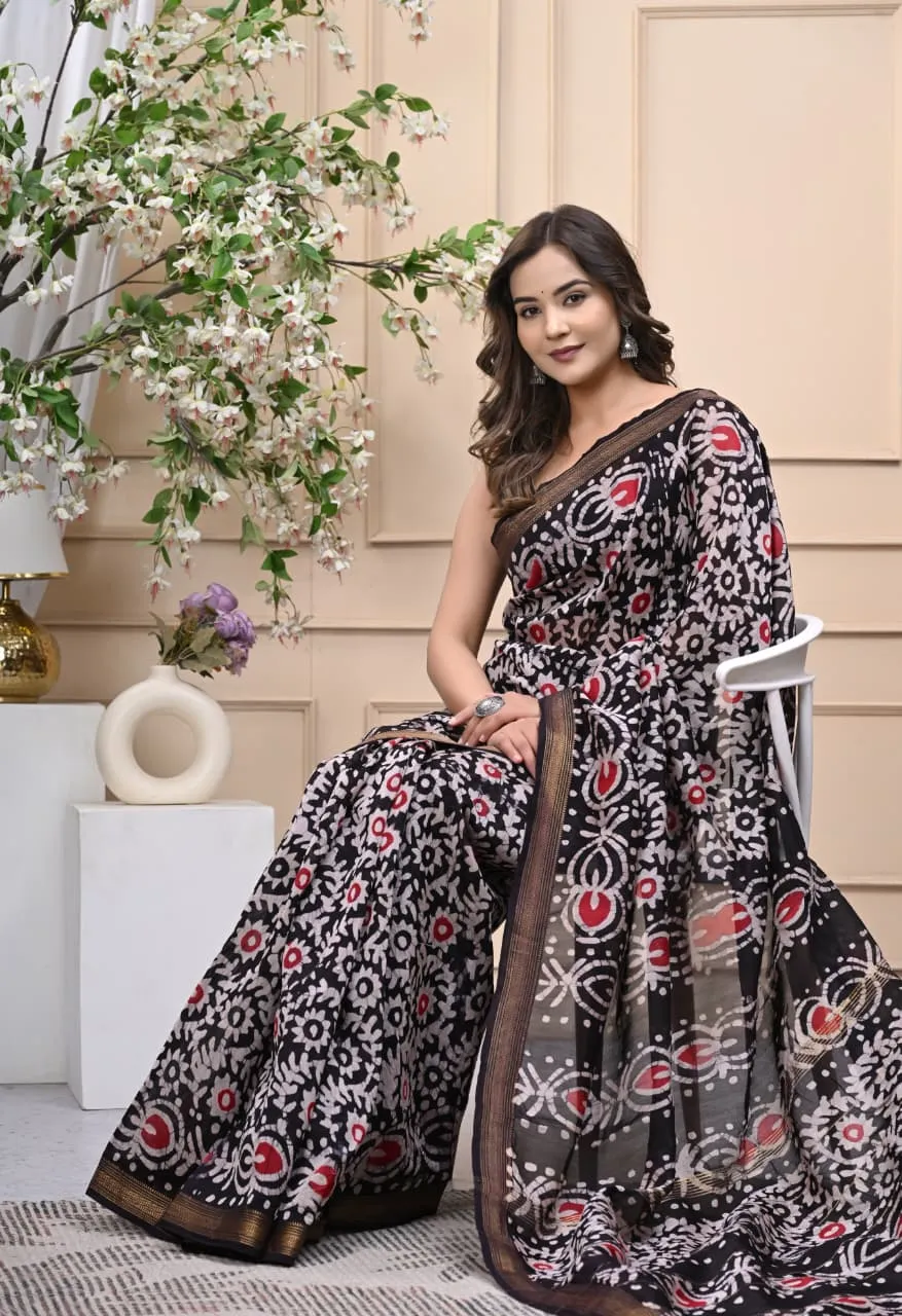Traditional Handblock Printed Maheshwari Silk Sarees – Black